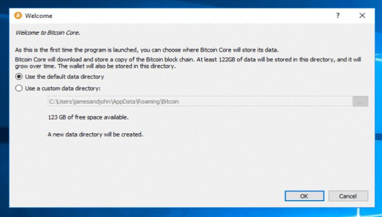 در صفحه باز شده، دایرکتوری را برای ذخیره بلاکچین و کیف پول خود انتخاب کنید. البته درصورتی که از پارتیشن‌های متفاوت استفاده نمی‌کنید می‌توانید آدرس پیش‌فرض را انتخاب کنید و فقط روی OK کلیک کنید.