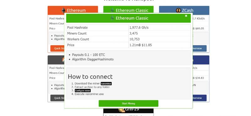 استخرهای استخراج اتریوم کلاسیک، نرم افزارهای مختلفی دارند که از آنها میتوان به نانوپول (Nanopool) یا اتر ماین (Ethermine) اشاره کرد. هر دوی این نرم افزارهای استخراج، یک گزینه شروع سریع دارند که شما را در استخراج اتریوم کلاسیک راهنمایی میکند. در نرم افزار نانوپول، به محض انتخاب اتریوم کلاسیک، به شما دستورالعملی داده میشود که در آن آخرین آمار مربوط به هش ریت استخر، تعداد استخراجکنندگان در دامنه و دامنه پرداخت به استخراجکنندگان، در آن وجود دارد.