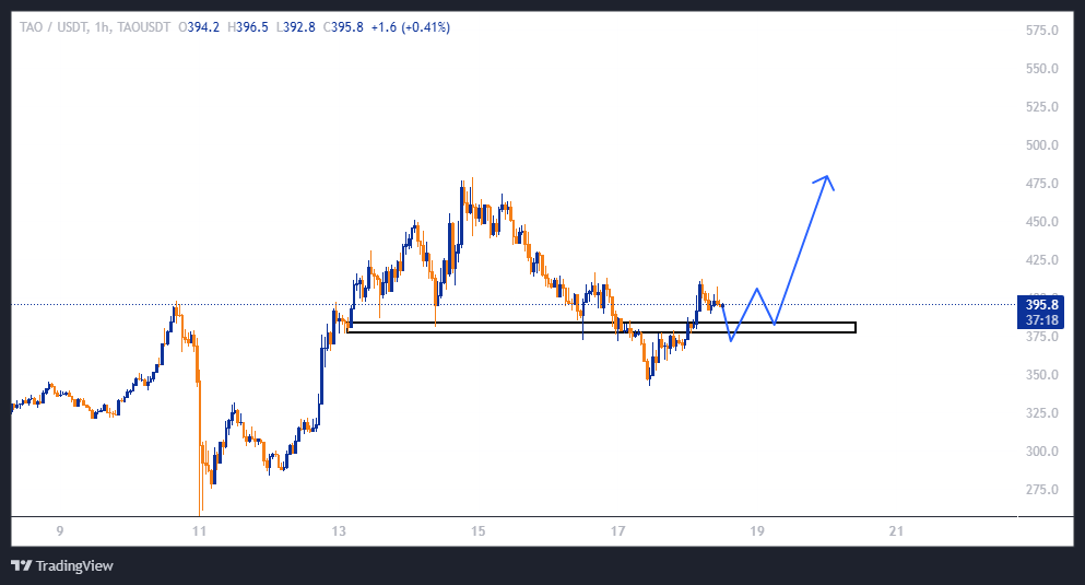 یه تحلیل از TAO داشتیم و گفتم در حال حاضر، بهترین ناحیه برای معامله محدوده ۳۷۵ تا ۳۸۵ دلاره و بهتره صبر کنید تا کف قبلیش که زیر ناحیه قرار داره رو استاپ فیشینگ کنه، یه همر صعودی بده و برو که بریم تا تارگت ۴۸۵ دلار؛ سودی ۱۲۵ درصدی با اهرم ۵!