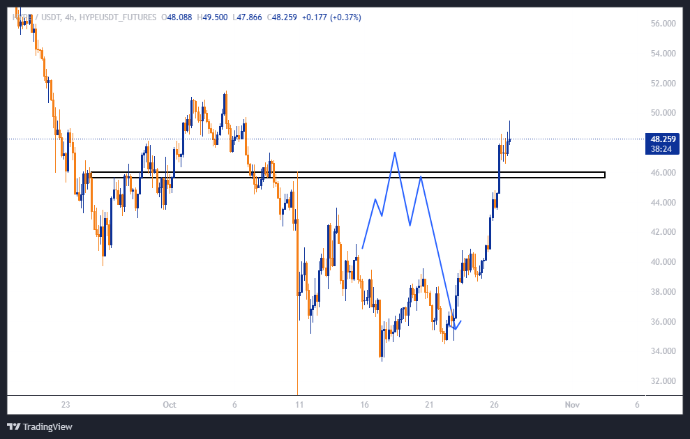 در تحلیل قبلی گفتم منتظر باشین قیمت به محدوده ۴۵ دلار اصلاح بده، یه همر صعودی تشکیل بشه و HYPE رو لانگ بشیم تا ۵۱ و ۵۶ دلار؛ سودی ۱۵۰ درصدی با اهرم ۵!