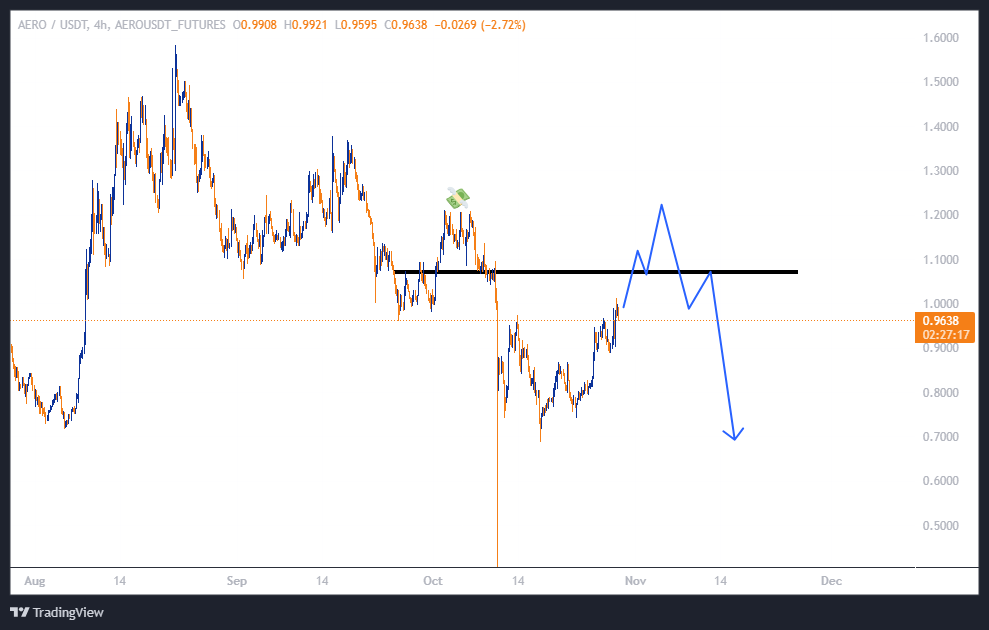 در تحلیل قبلی گفتم بهترین ناحیه برای معامله AERO محدوده ۱.۰۷ دلاره. بهتره صبر کنید تا قیمت به محدوده برگرده، سقف‌های قبلیش که بالای ناحیه قرار دارن رو استاپ فیشینگ کنه، ریزش کنه، در برگشت به محدوده یه همر نزولی بده و برو که بریم تا تارگت ۰.۷ دلار؛ سودی ۱۷۵ درصدی با اهرم ۵!