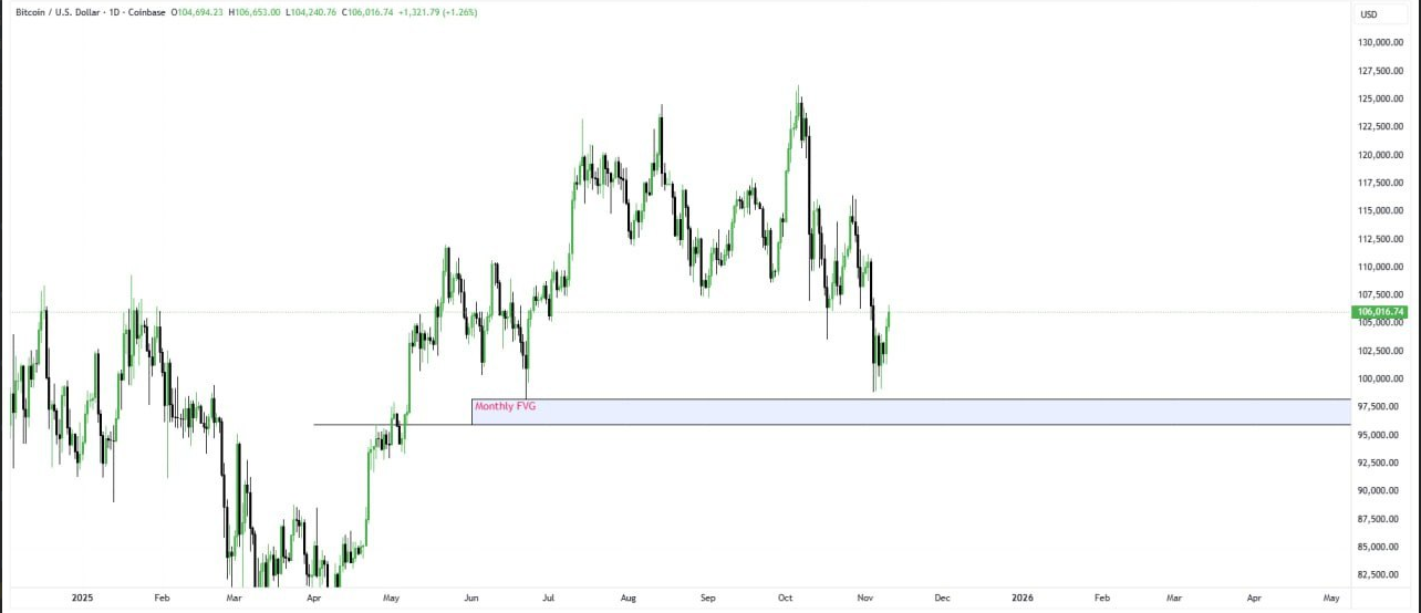 سناریوی صعودی : اگر قیمت بتواند به سرعت بالای سطح $۱۰۰,۰۰۰ تثبیت شود و حرکت صعودی خود را از ناحیهی FVG تکمیل کند، حرکت تا ناحیهی مقاومت $۱۰۶,۰۰۰ – $۱۰۷,۰۰۰ محتمل است. شکست قاطع و تثبیت (با یک کندل ۱D یا ۴H قوی) بالای $۱۰۷,۰۰۰، مسیر را برای سقفهای بالاتر باز خواهد کرد.