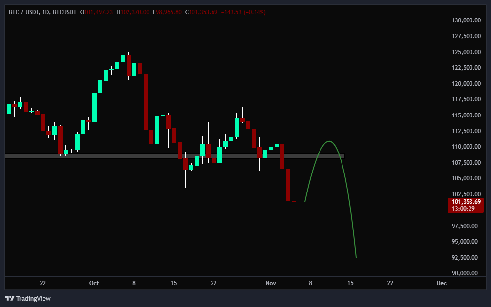 طبق سناریوی قبلی انتظار داشتیم یه برگشت تا محدوده ۱۰۸ هزار دلار داشته باشه، استاپهای اون بالا رو جمع کنه و بعد بریزه، اما مسیر رو نصفه ول کرد و مستقیم ریخت پایین.