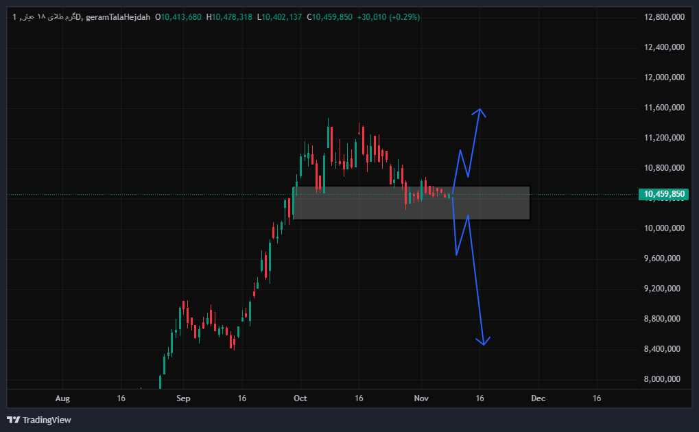 الانم سناریو همینه که قیمت تا محدوده ۱۰ تا ۱۱ میلیون تومن بیاد، ورود خریدارا رو دیدیم، طلا بگیریم تا سقف قبلی!