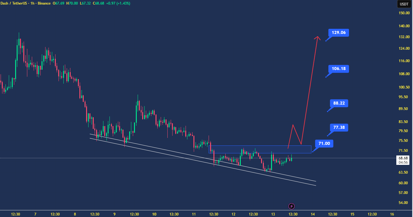 رفقا دش (ِDASH) دقیقاً طبق سناریوی ما حرکت کرد کفسازی خوب، شکست مقاومت ۷۱ دلار و تست دوباره این محدوده به عنوان حمایت… و بعدش یه پامپ ۳۸ درصد تو اسپات. تو فیوچرز هم که میشد با لوریج سودتونو چند برابر کنید.، ولی ما خونسردیم و عجله نداریم.