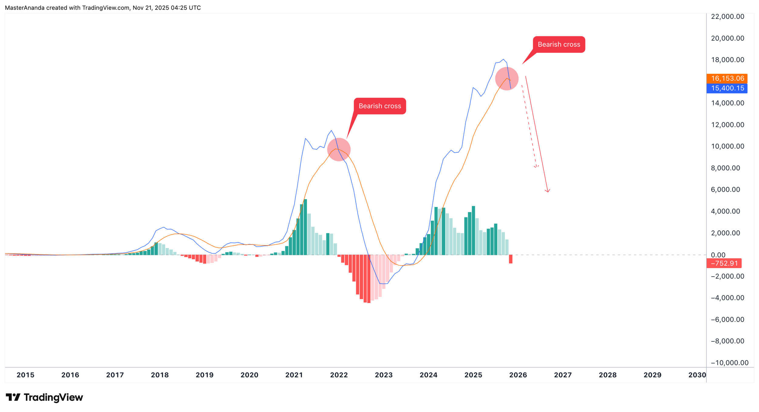 روی تایمفریم ماهانه، اندیکاتور MACD یک کراس نزولی داده. تو گذشته، هر وقت این اتفاق افتاده: