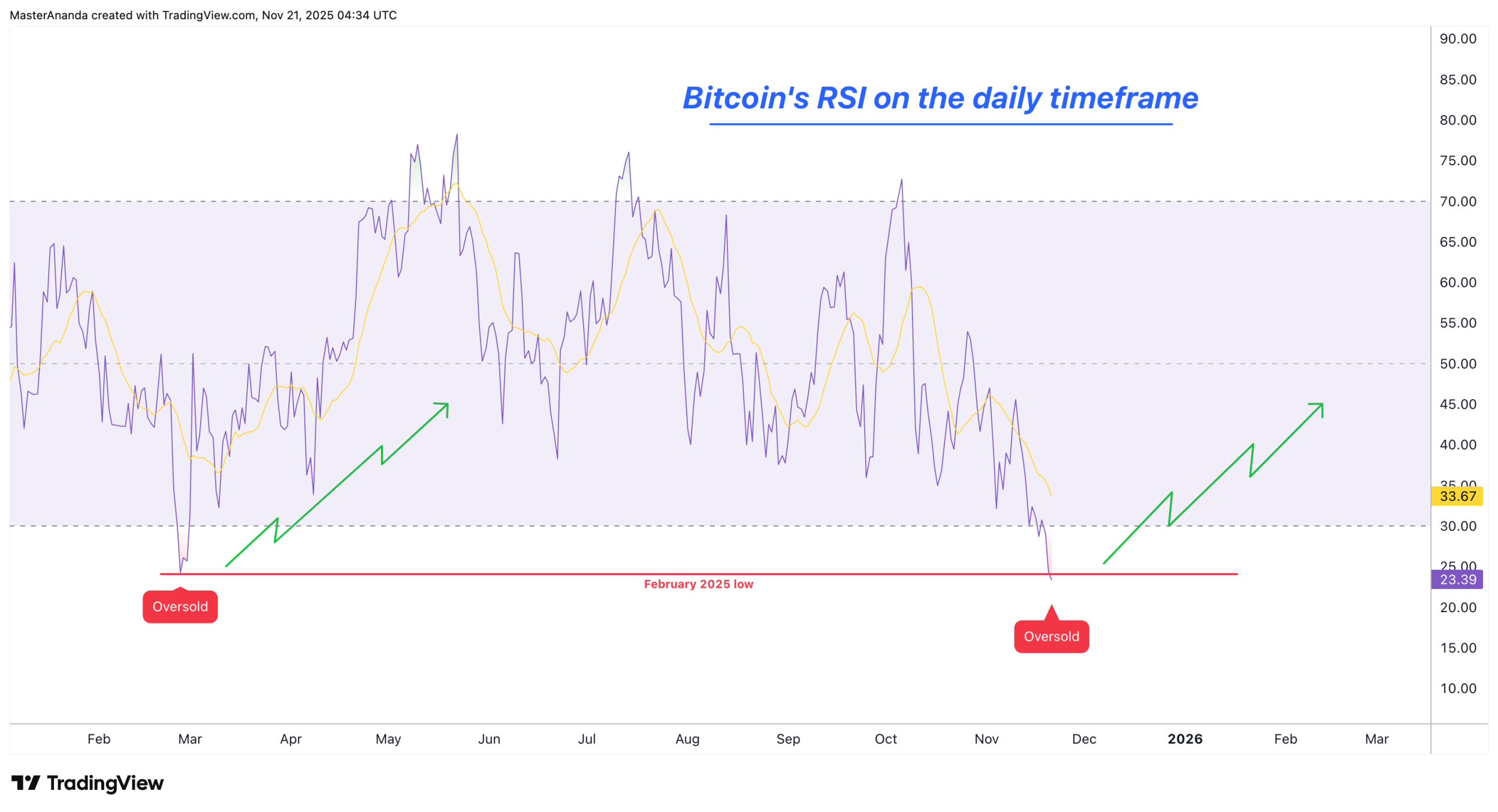 اندیکاتور RSI وارد محدوده Oversold شده، یعنی قیمت بیشازحد فروختهشده و معمولاً بعدش یک برگشت اتفاق میفته. آخرین بار RSI به این شدت ضعیف شد فوری برگشت نزد، ولی در چند هفته بعد یک رالی قوی شروع شد.