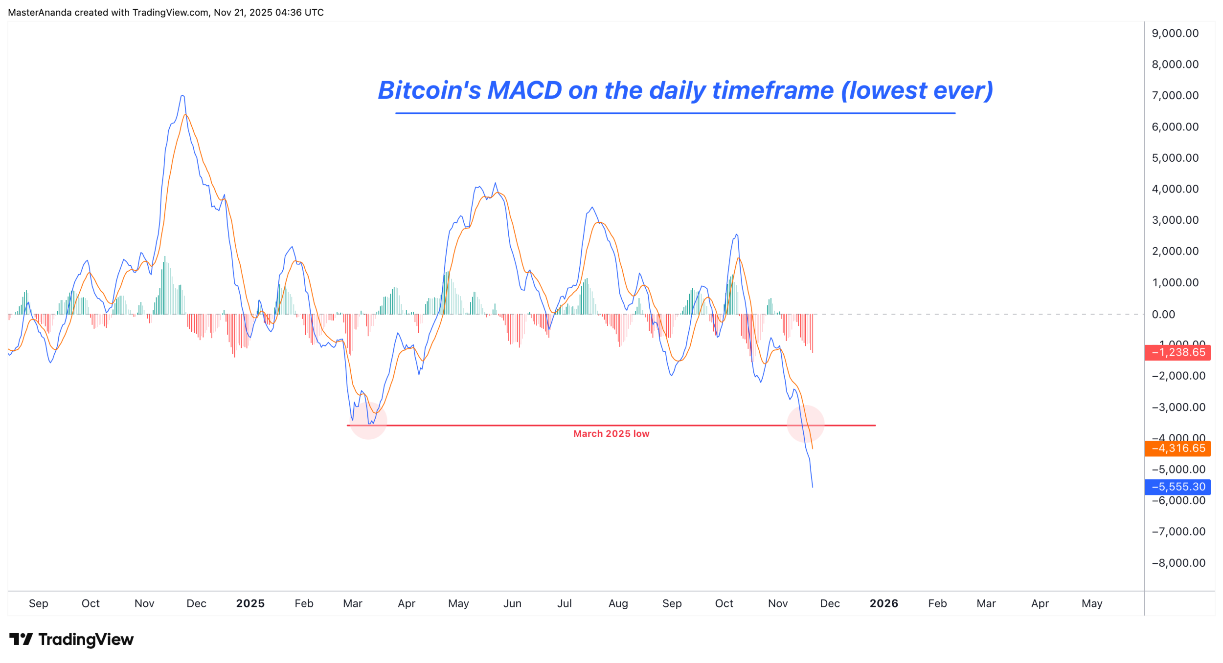 مکدی MACD در تایم فریم روزانه الان کمترین مقدار خودش از سال ۲۰۱۹ به بعد رو ثبت کرده. این میتونه دو معنا داشته باشه:
