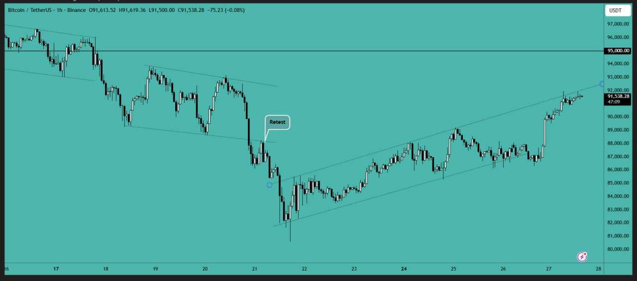 در ادامه وضعیت دیروز که بیت‌کوین با یک حرکت قوی تا خط مقاومت کانال رسیده بود، امروز می‌بینیم قیمت نتوانسته از ناحیه نود و دو هزار عبور کند و زیر خط روند قرار گرفته است. این واکنش نشان می‌دهد فشار فروش در همان محدوده فعال شده و تثبیت قیمت در بالای مقاومت شکل نگرفته است.