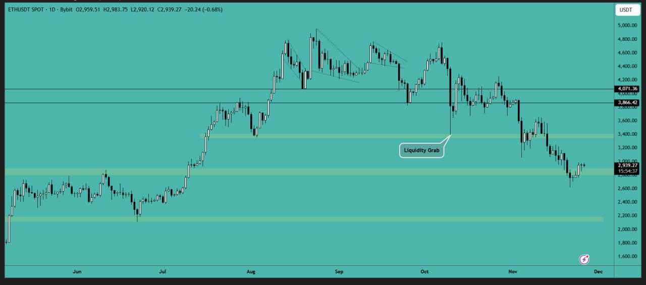 سطح ۳۰۰۰ دلار برای اتریوم یک ناحیه اصلی و روانی است. بازگشت قیمت به این محدوده، خود به تنهایی سیگنال ورود نیست. ناحیه حمایت اصلی محدوده ۲۸۵۰ دلار به عنوان حمایت کلیدی و منطقیتر برای ورود مد نظر است. برای ورود باید صبر کرد تا یا قیمت به محدوده ۲۸۵۰ دلار بازگردد و با نشانههای بازگشت تثبیت شود، یا شکست قاطع و همراه با حجم بالای محدوده ۳۱۵۰-۳۱۰۰ دلار تأیید گردد.