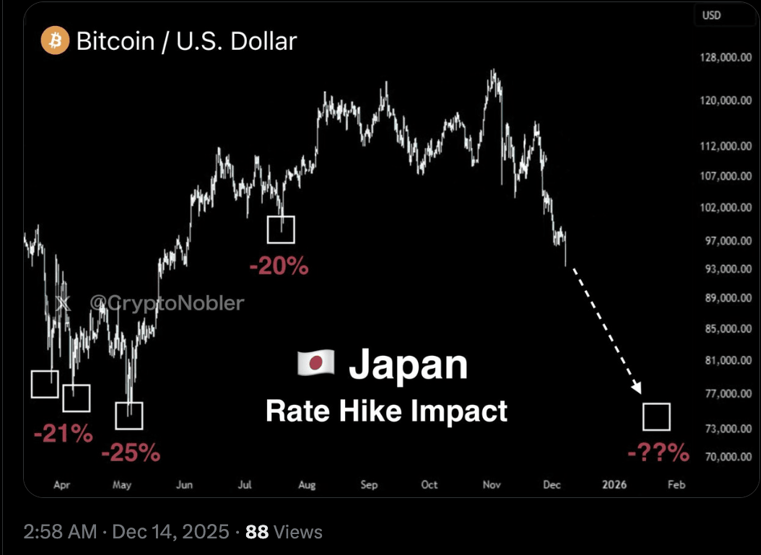 تاریخ نشون داده هر وقت بانک مرکزی ژاپن نرخ بهره رو بالا برده، بیتکوین اصلاحهای ۲۰ تا ۳۲ درصدی رو تجربه کرده. حالا هم با احتمال بالای ۹۰٪ افزایش نرخ تو جلسه جمعه انجام میشه و ریسک تکرار این سناریو زیاد شده.