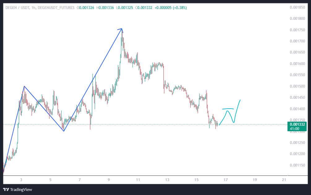 سناریو معاملاتی ما برای DEGEN چی بود؟ گفتم صبر کنید قیمت سطح ۰.۰۰۱۴ دلار رو به بالا شکست، باید وارد معامله بشید و برید تا تارگت ۰.۰۰۱۶۵ دلار. تصویر رو ببینید متوجه میشید که این اتفاق نیوفتاد و مارکت ریزش کرد! فعلا هم سناریویی نیست تا ببینیم قیمت چه میکنه.