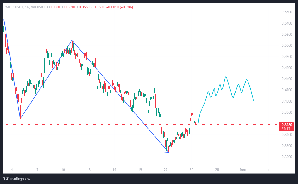 تو تحلیل قبلی سناریو رو براتون گفتم: «بذارید قیمت یه برگشت بزنه سمت ۰.۴۴ دلار و اگه همون بالا ضعف دیدین—کندلها ورود فروشندگان رو نشون دادن، حرکت کند شد، یه روند کوچولو نزولی شکل گرفت—اونوقت میشه WIF رو شورت کرد تا حدود ۰.۳ دلار. »