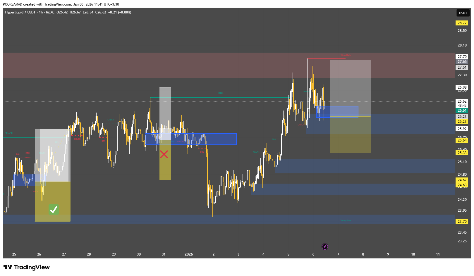 در HYPE/USDT پولبک به ناحیه تقاضای فعال انجام شده، BOS صعودی حفظ شده و جذب فروش در تایم پایین مشاهده می‌شود؛ مومنتوم همچنان مثبت است و تریگر ورود معتبر می‌باشد. ستاپ معاملاتی (LONG | Leverage 25): Entry Zone: 26.60 – ۲۶.۹۰