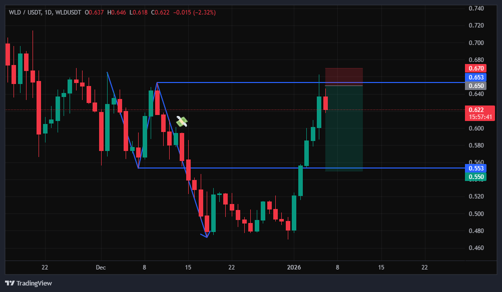 در تحلیل قبلی گفتم: «WLD میتونه تا محدوده پر از نقدینگی ۰.۶ دلار حرکت داشته باشه و از اون محدوده شورت رو داشته باشیم. روی نقطه ورود ۰.۶۵ دلار، استاپ ۰.۶۷ دلار و تارگت ۰.۵۵ دلار، اردر کاشتیم و منتظر پر شدنش هستیم!»