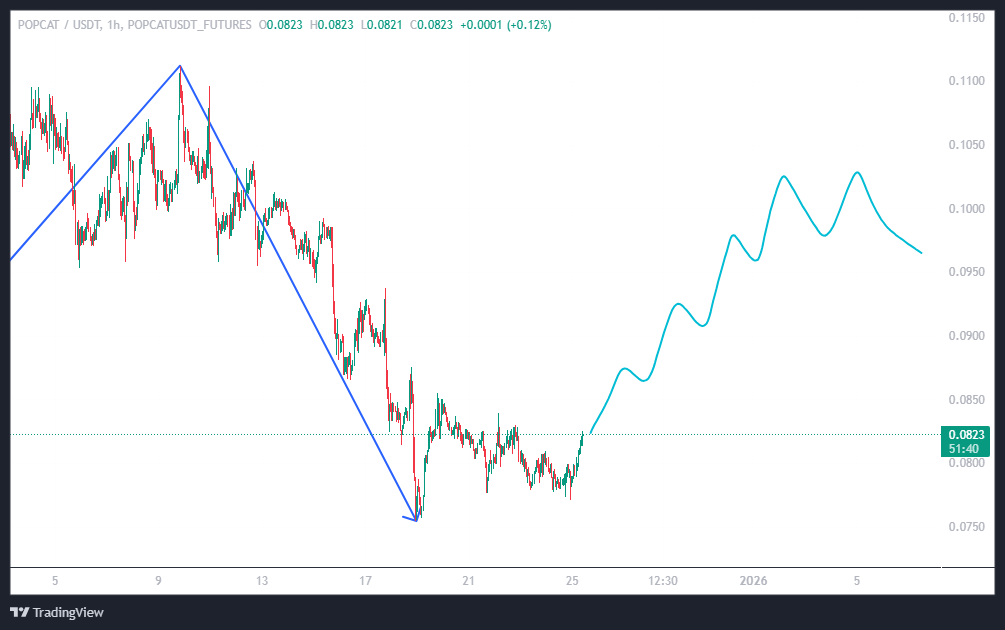 گفتم: «عجله نکنید و بذارید قیمت یه برگشت داشته باشه سمت محدوده ۰.۱ دلار. اونجا اگر دوباره ضعف نشون بده، یعنی یه خستگی تو روند ببینیم، کندلها شل کنن، تکوناش کوچیک بشه، میشه خیلی مشتی POPCAT رو دوباره شورت کرد تا ۰.۰۷۵ دلار.»