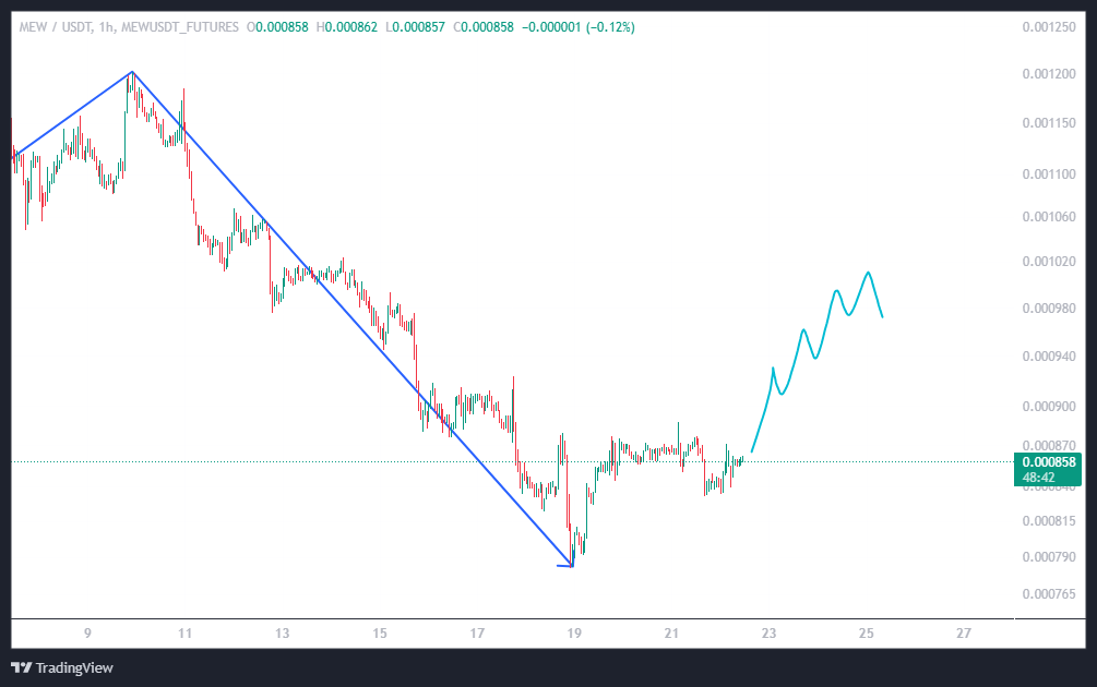 سناریو قبلی گفتم: «صبر کنید قیمت یه برگشت داشته باشه سمت محدوده ۰.۰۰۱ دلار. اونجا اگر دوباره ضعف نشون بده، یعنی یه خستگی تو روند ببینیم، کندلها شل کنن، تکوناش کوچیک بشه، میشه خیلی مشتی MEW رو دوباره شورت کرد تا ۰.۰۰۰۸ دلار.»