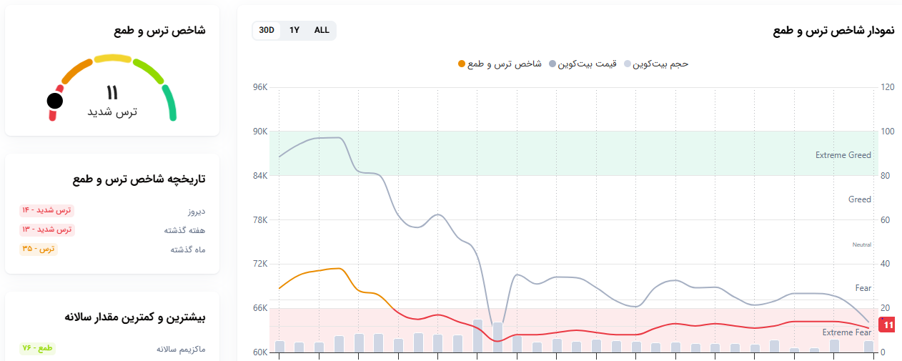 از طرفی شاخص ترس و طمع اکنون در عدد ۱۱ است چندی پیش به عدد ۵ رسید و هنوز در فاز ترس شدید قرار دارد که نشانگر عدم اعتماد به بازار است ولی تاریخ نشان داده رشد های بزرگ از همین جا ها شروع می شود از طرفی دامیننس بیت کوین در محدوده ۵۸ درصد است ولی هنوز پایین ۶۰ درصد قرار دارد زمانی که این شاخص حداقل به محدوده ۴۵ برسد میتوان انتظار یک آلت سیزن قوی را داشت البته این برای آشنایی دوستانی است که هنوز شناخت دقیقی نسبت به بازار ندارند