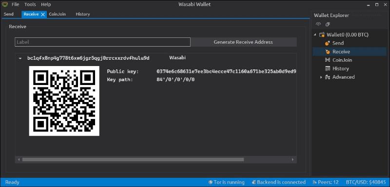 حال، آدرس ایجادشده در کیف پول واسابی (Wasabi wallet) به شما نمایش داده می‌شود. پس از واریز بیت کوین به کیف پول خود، این آدرس حذف خواهد شد تا در تراکنش‌های بعدی برای استفاده مجدد از آن وسوسه نشوید!