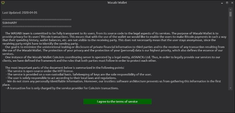 پس از آن، مشاهده خواهید کرد که آیکون کیف پول Wasabi در دسکتاپ شما ظاهر شده است. پس از باز کردن برنامه، چنین صفحه‌ای برای شما باز می‌شود. پس از خواندن شرایط، ضوابط و سیاست‌های حفظ حریم خصوصی، روی گزینه I agree to the terms of service کلیک و با آن موافقت کنید.