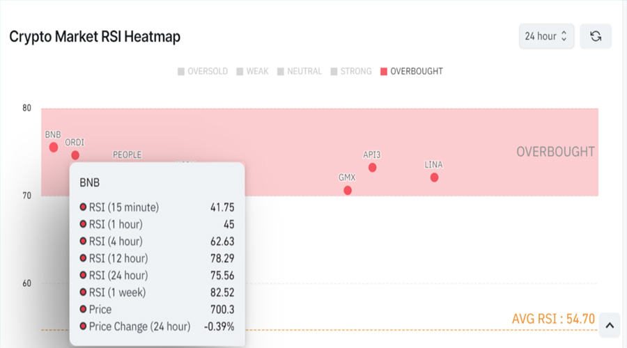 بایننس کوین (BNB) در زمان نگارش خبر با ۲.۵۲ درصد کاهش قیمت حدود ۶۸۸.۷ دلار است. RSI بایننس کوین در بازه روزانه برابر با ۷۵.۵۶ و بیانگر فشار خرید قوی است که ممکن است پایدار نباشد. همچنین میزان RSI هفته‌ای روی ۸۲.۵۲ قرار دارد که شرایط اشباع خرید طولانی‌مدت و احتمال اصلاح قیمت را بیان می‌کند. بایننس کوین اخیراً به بالاترین حد تاریخی خود یعنی ۷۲۰.۴۳ دلار رسیده که بر ارزش‌گذاری بیش از حد و اشباع بازار تأکید می‌کند.