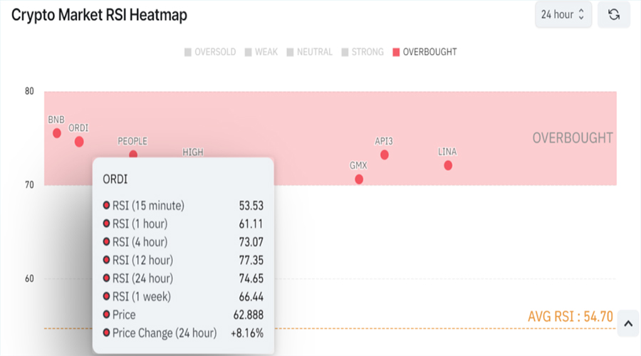 ارز دیجیتال اردی (ORDI)، اولین توکن ضرب‌شده با استفاده از استاندارد BRC-20 در ۲۴ ساعت گذشته با ۴.۶۷ درصد کاهش در محدوده قیمتی ۶۰.۱ دلار معامله می‌شود و RSI روزانه آن در محدوده ۷۴.۶۵، اشباع خرید را نشان می‌دهد.