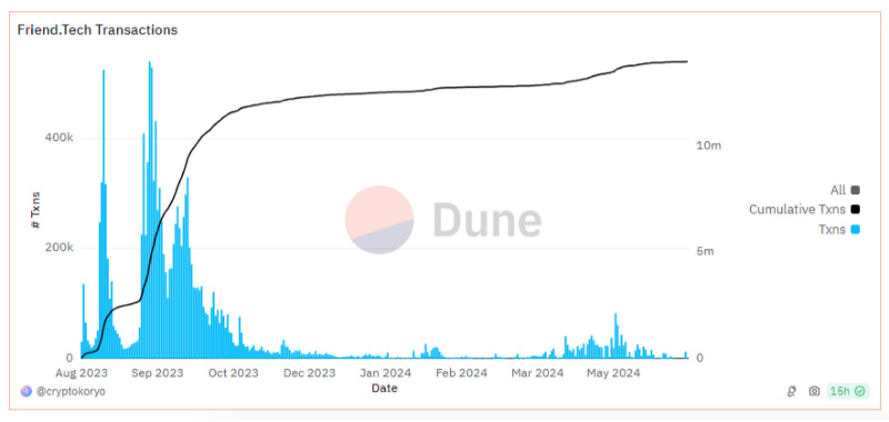 به نظر می‌رسد عملکرد ضعیف فرند.تک در ماه‌های اخیر، در تصمیم برای ساخت یک بلاکچین اختصاصی بی‌تأثیر نبوده است. طبق داده‌های دون آنالیتکس (Dune Analytics) اخیراً حجم تراکنش‌های روزانه این پلتفرم از ۵۰۰ هزار در زمان اوج خود (آگوست و سپتامبر ۲۰۲۳) کاهش یافته و به ۱۰۰۰ تراکنش رسیده است.