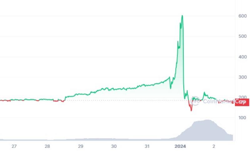 طی معاملات آخر هفته، قیمت آتی توکن TRB در صرافی OKX از 180 به 737 دلار و قیمت‌ اسپات آن در صرافی بایننس به نزدیکی 600 دلار رسید. معامله‌گران احتمالاً انتظار افزایش بیشتر قیمت‌ها را داشتند، اما با شروع فروش دارایی توسط دارندگان، قیمت‌ آن بیش از 70 درصد کاهش یافت و به سطح 177 دلار رسید.