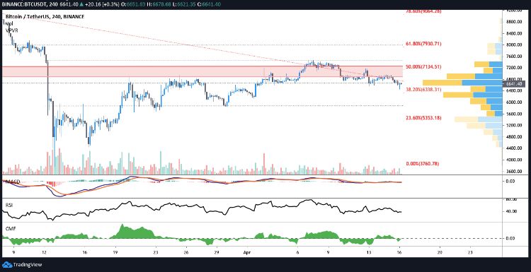 در بازه زمانی کوتاه‌تر، می‌توان مشاهده کرد که قیمت به کمتر از میانگین حرکت در اندیکاتور بولینگر باند رسیده است. اما باتوجه به این‌که ناحیه حمایتی 6,650 دلار از دست رفته است، نمودار شمعی و افزایش حجم فروش نشان می‌دهد که تریدرها کمترین میزان خرید را دارند. با این وجود، برای اینکه امیدی برای رسیدن دوباره قیمت بیت کوین به محدوده 6,900 تا 7,000 دلار وجود داشته باشد، نیاز است که یک توقف چهار ساعته در بالاتر از 6,763 دلار را مشاهده کنیم.