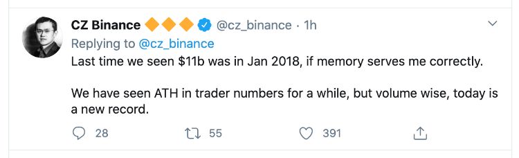 بر اساس پست توییتری CZ، آخرین باری که حجم معاملات این صرافی به 11 میلیارد دلار نزدیک شد در اوایل 2018 بود. امروز آنها به یک رکورد جدید در حجم معاملات رسیدند.