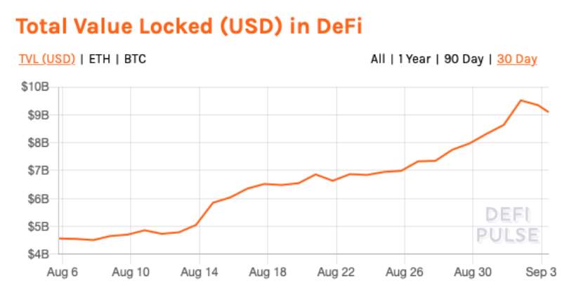 اخیراً تریدرها از تب‌وتاب حدس و گمان در خصوص امور مالی غیرمتمرکز یا همان DeFi افتاده‌اند و در عوض، بیشتر وقت خود را روی اتریوم، دومین ابَر بلاکچین، صرف می­کنند. قیمت اتر، ارز اتریوم، پنجشنبه گذشته بعد از افت 7.6% در روزچهارشنبه به میزان 8.3% کاهش داشت. اما این کاهش قیمت­ها بعد از رشد 54% در جولای و 25% در آگوست، به خاطر اخبار سرازیر شدن دلار به سمت DeFi، خصوصاً پس از آغاز به کار پروژه­هایی همچون Compound و yEarn.Finance و SushiSwap اتفاق افتاد. این پروژه­ها توجه تریدرها را به یلد فارمینگ (yield farming) با رشدی سریع و پرسود اما همراه با ریسک، جلب کرده بود. ارزش کل دیفای (DeFi) در آگوست به بیش از دو برابر و به عدد 9.5 میلیارد دلار رسید، ولی طبق گزارشات سایت DeFi Pulse در چند روز اخیر این میزان به 9.1 میلیارد دلار کاهش یافته است.