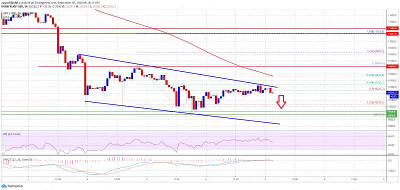 • کانال نزولی شکل‌دهنده مقاومت نزدیک 10,300 دلار در جدول ساعتی ‌بیت کوین/دلار وجود دارد.