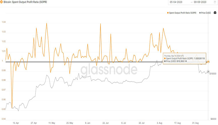 سهم سود خروجی هزینه شده (SOPR) بیان می‌کند که دارندگان بیت کوین سود می‌کنند یا نه. این میزان از تقسیم قیمت فروش به فیمت پرداختی محاسبه می‌شود. زمانی که SORP بزرگ‌تر از 1 شود، به منزله این است که مالکان خروجی‌های هزینه شده در هنگام تراکنش سود می‌کنند. در غیر این صورت، ضرر می‌کنند. همان طور که مشاهده می‌شود، SORP در زمان نگارش بالاتر از 1 قرار دارد.
