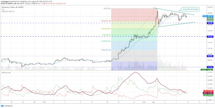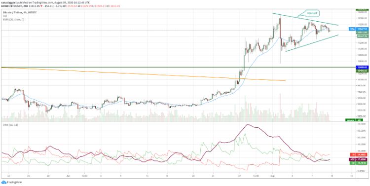 همان‌طور که در تحلیل تکنیکال قیمت بیت کوین و اتریوم هفته گذشته گفتیم، گاوها در نقاط افت قیمت در 2 آگوست، خرید کردند و قیمت را دوباره بالا کشیدند، اما آن‌ها با مقاومتی در نزدیکی محدوده بالایی یعنی 12,113.50 تا 12,304.37 دلار روبرو هستند. جفت‌ارز بیت کوین و دلار آمریکا، یک الگوی پرچم سه‌گوش تشکیل داده است، که معمولا به‌عنوان یک الگوی مداومت و تمدید روند عمل می‌کند.