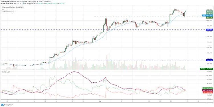 خرسها در نمودار چهار ساعته، قیمت را به کمتر از EMA بیست روزه رساندهاند، اما نتوانستهاند قیمت را در کمتر از حمایت 415.634 دلاری حفظ کنند، که نشان میدهد گاوها با تلاش زیاد درحال دفاع از این حمایت هستند. اگر گاوها حالا بتوانند قیمت را به بالاتر از 444.15 دلار برسانند، احتمالا روند صعودی بازمیگردد.
