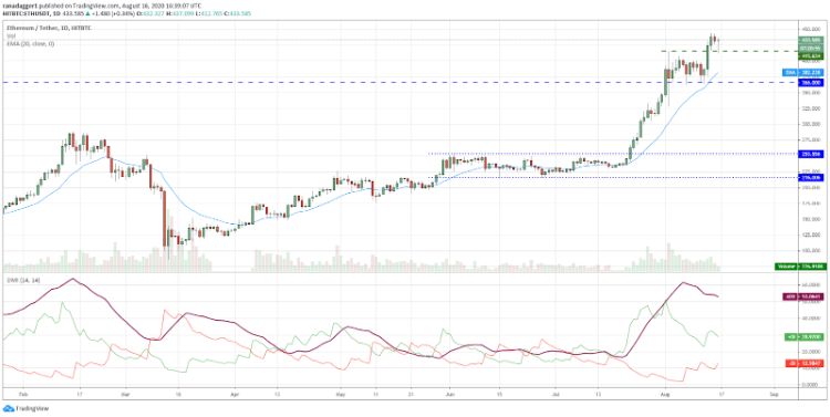 درمقابل، اگر خرسها قیمت را به کمتر از 415.634 دلار برسانند و در این سطح حفظ کنند، سقوطی به EMA بیست روزه امکانپذیر است. اگر قیمت از این ناحیه حمایت بازگردد، گاوها دوباره تلاش خواهند کرد که روند صعودی را بازگردانند.