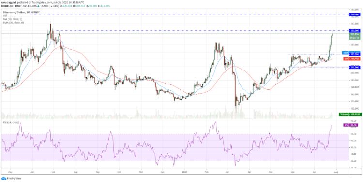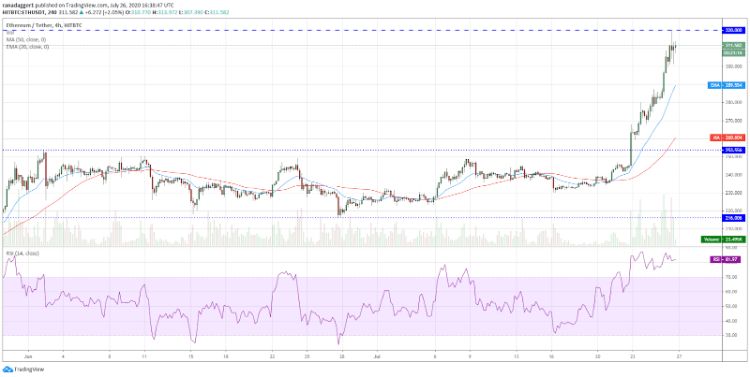 این هجوم برای خرید، سریعا قیمت دومین رمزارز برتر بازار را به اولین تارگت خود یعنی 320 دلار رساند. شاخص RSI نیز به بالاتر از سطوح 80 رسیده است، که نشان می‌دهد این افزایش قیمت موجب وضعیت بیش از حد خریده شده (overbought) در کوتاه مدت شده است.