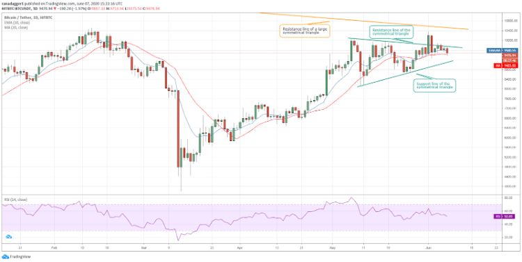 بیت کوین در یک موقعیت بحرانی قرار دارد. در 1 ژوئن، گاوها قیمت را به بالاتر از خط مقاومت مثلث متقارن کشاندند. با این وجود، به دلیل کمبود حجم خرید، قیمت در 2 ژوئن دوباره به داخل مثلث کاهش پیدا کرد.