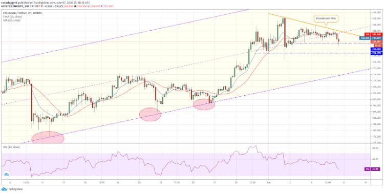 خرسها شدیدا تلاش میکنند که از خط نزولی دفاع کنند درحالی که گاوها تلاش میکنند جفتارز اتریوم و دلار آمریکا را بالای 236 دلار نگه دارند. اگر این جفتارز به کمتر از 236 دلار برسد، ممکن است به 229 دلار و سپس خط حمایت کانال صعودی، سقوط کند.