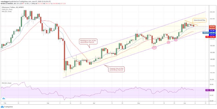 اتریوم در یک روند صعودی قرار دارد و در چند هفته اخیر در کانال صعودی معامله شده است. درحال حاضر، قیمت بین EMA ده روزه (235 دلار) و خط روند نزولی، گیر کرده است.
