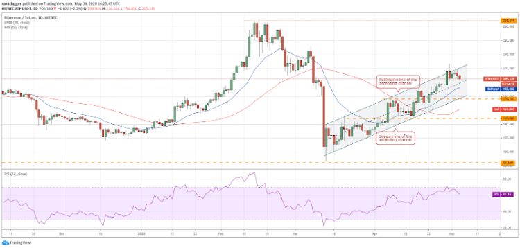 اتریوم در سوم می از خط مقاومت کانال صعودی پایینتر رفت. این موجب فروش برای حفظ سود توسط تریدرهای کوتاه مدت شد، که نهایتاً سقوط EMA بیست روزه (192 دلار) را در پی داشت.