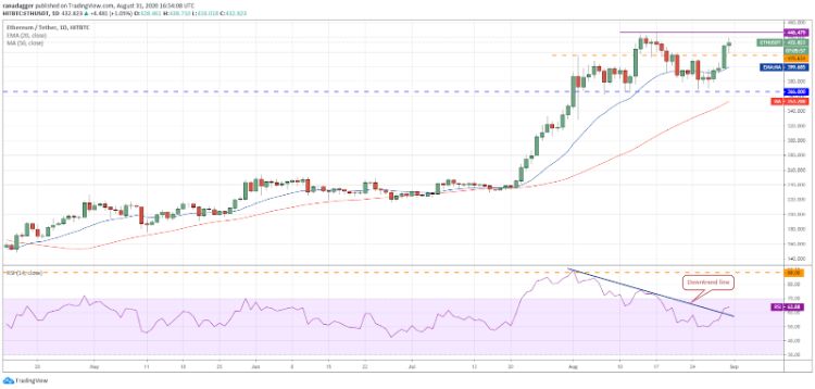 گاوها قیمت اتریوم را در 28 آگوست، به بالاتر از EMA بیست روزه (400 دلار) رساندند و آن را با یک حرکت قدرتمند در 30 آگوست ادامه دادند، که باعث شد قیمت به بالاتر از مقاومت 415.634 دلاری برسد.