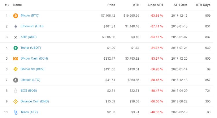 عملکرد اتریوم و بیت کوین در بیشترین رکورد کاهش. منبع: athcoinindex