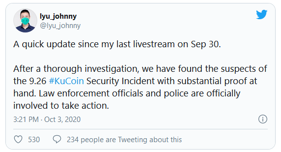 جانی لیو (Johnny Lyu)، مدیرعامل KuCoin در روز 3 اکتبر در توییتی گفت که این صرافی اکنون مدارک مهمی در دست دارد که نشان میدهد چه کسانی در تاریخ 26 سپتامبر KuCoin را هک کردند.
