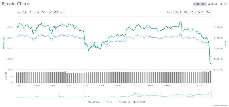 بر اساس داده‌های منتشرشده توسط وب‌سایت کوین‌مارکت‌کپ (CoinMarketCap)، ارز دیجیتال بیت‌کوین در حال حاضر با قیمت ۱۸،۸۸۰ دلار معامله می‌شود که نسبت به ۲۴ ساعت گذشته، ۱٫۹ درصد افت داشته است. علاوه‌براین، ارزش جاری بازار بیت‌کوین، ۳۴۹٫۰۸۲ میلیارد دلار بوده و میزان تسلط آن بر بازار ارزهای دیجیتال نیز، ۶۲٫۸ درصد گزارش شده است.
