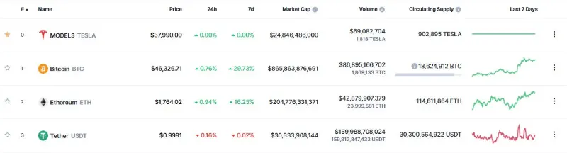 در تاریخ ۹ فوریه، وبسایت کوینمارکتکپ (CoinMarketCap)، یکی از معتبرترین مراجع دادههای ارزهای دیجیتال، به پاس یادبود و قدردانی از خرید ۱٫۵ میلیارد دلار بیت کوین (BTC) توسط شرکت تسلا (Tesla)، نماد خودرو تسلا مدل ۳ (Tesla Model 3)، پرفروشترین خودروی الکتریکی جهان را به صدر فهرست خود و بالاتر از بیت کوین اضافه کرد.