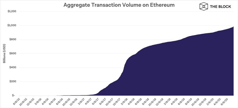 با توجه به گزارش «The Block»، حجم کل معاملات اتریوم تا روز 9 مرداد به 986 میلیارد دلار رسید. اتریوم از سال 2018 با رشد تصاعدی، روند رو به رشد خودش را پیوسته حفظ کرده و آن را تا به امروز ادامه داده است. نمودار زیر به خوبی این رشد را نشان داده است: