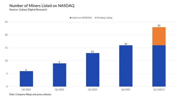 در دو سال گذشته، همزمان با افزایش قیمت بیت کوین، تعداد شرکتهای استخراج این ارز دیجیتال نیز افزایش یافته است. در زمستان سال 2021 شش شرکت ماینینگ در لیست NASDAQ وجود داشت اما این تعداد امروز به 16 شرکت رسیده است. حالا تعداد شرکتهای استخراج بیت کوین نسبت به مدت مشابه در سال گذشته بیش از دو برابر شده و ۷ شرکت نیز هماکنون در لیست انتظار حضور دارند.