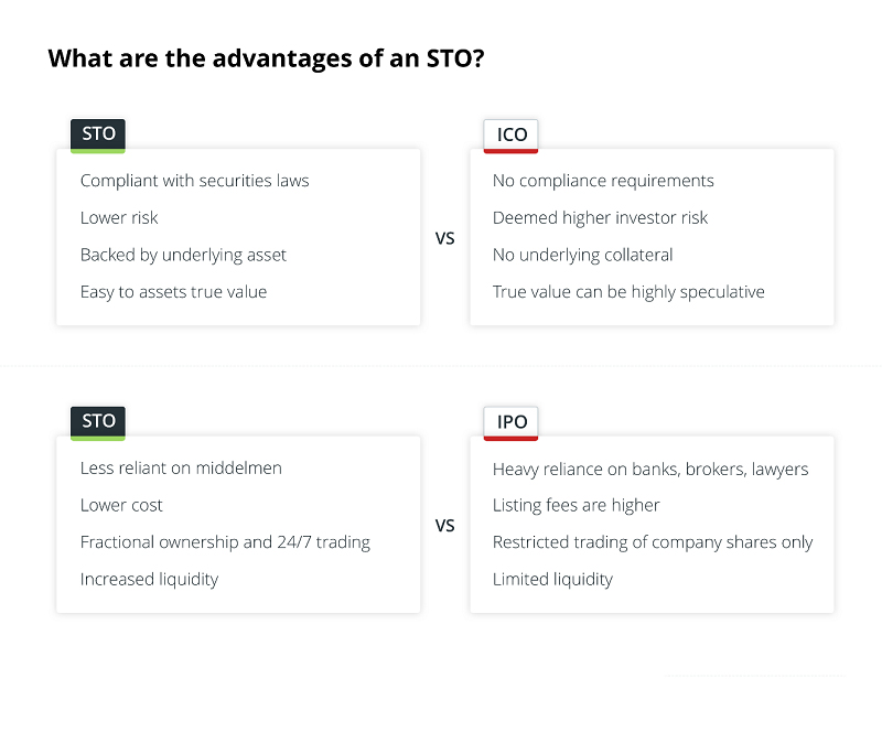 در مقایسه با IPOهای سنتی، STO به دلیل حذف واسطههای مثل بانکها و کارگزاریها، ارزانتر است. قراردادهای هوشمند وابستگی به وکلا را کاهش میدهند و بلاکچین نیاز به تشریفات اداری را کم میکند. این باعث افزایش سرعت فرایند و ارزانتر شدن آن میشود. مالکیت مشترک و توانایی تجارت ۲۴ ساعته در مقایسه با وجود داراییهای سنتی که دارای نقدینگی ناچیزی هستند مانند نقاشیهای کمیاب، داراییها و کلکسیونها، نقدینگی بیشتری را به بازار میآورد.