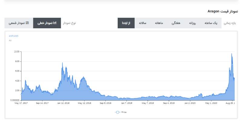همان‌طور که ملاحظه می‌کنید، قیمت آراگون از زمان عرضۀ اولیۀ آن تا سال 2020 نوسانات زیادی را تجربه کرده است. قیمت Aragon در بیشترین مقدار خود در 13 آگوست 2020 به میزان 11.45 دلار رسید. همچنین در کمترین حالت، قیمت آراگون در تاریخ 25 نوامبر 2018 به 0.285 دلار رسید که نشان‌دهنده نوسانات زیاد قیمت آن می‌باشد.